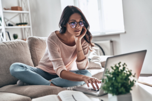 Surfing,The,Net.,Thoughtful,Young,Woman,In,Eyewear,Using,Computer